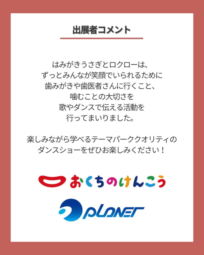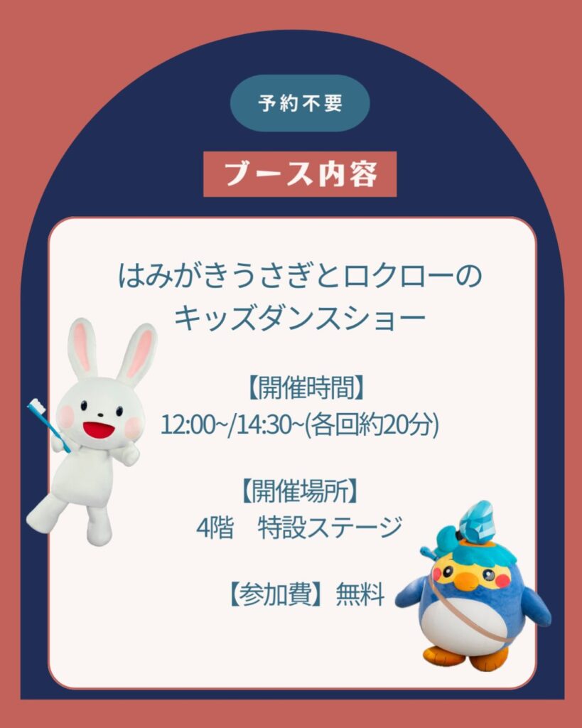| 詳細 | ◆ステージイベント◆ はみがきうさぎ・ロクロー・ふくまるくん 「はみがきうさぎとロクローのキッズダンスショー」 ◆出店ブース◆ NPO法人おくちのけんこう&株式会社プラネット 「はみがきうさぎとロクローの体験コーナー」 |