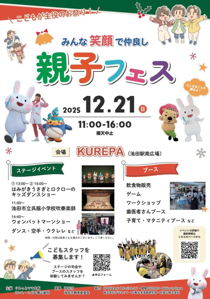 | 12月21日(日) | みんな笑顔で仲良し!親子フェス(大阪府池田市)池田駅南広場 |